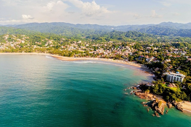 The Riviera Nayarit is a 200-mile long destination on Mexico's Pacific coastline with a mix of luxury resorts, surfing towns, secluded beaches, and jungle-covered mountains. As a diverse alternative to nearby Puerto Vallarta, it offers activities like whale watching to cultural immersion in historic villages like picturesque San Sebastián del Oeste.