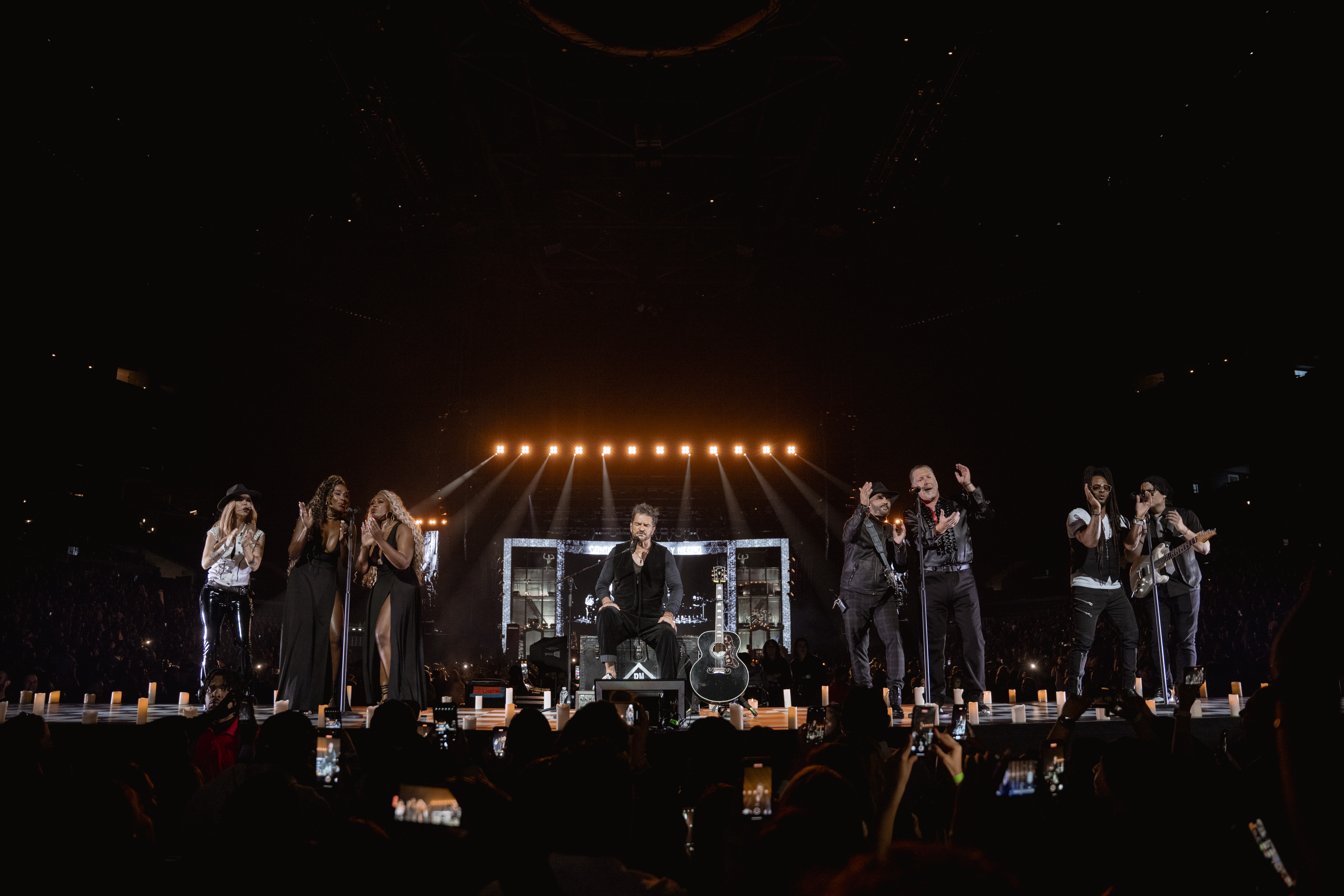 Arjona's musical repertoire fulfilled his intention of showcasing how music is experienced through his lyrics, with hits such as "Te Conozco," "Minutos," "Historia de Taxi," "Desunda," "Si el Norte fuera el Sur," "Señora de las 4 Décadas," and "Mujeres," which evoked passionate responses from his audience. The medleys with classics such as "El Problema," "Acompáñame a Estar Solo," "El Amor," and "Apnea" allowed the artist to connect with the nostalgia of his euphoric fan base.